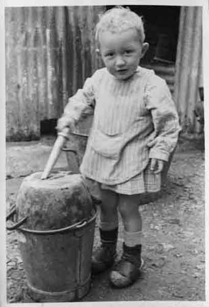 Petit enfant tenant un plantoir et qui joue à agrandir le trou d'une bassine percée à Aytré en 1950