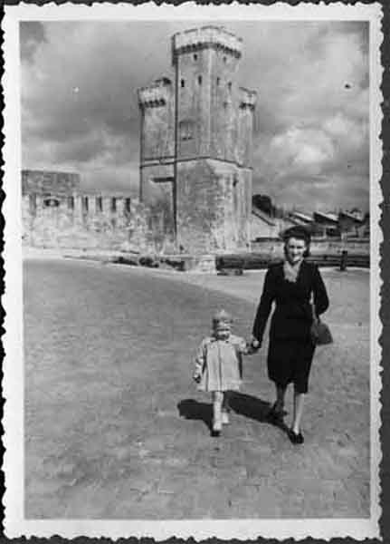 Une mère et son fils devant la Tour Saint Nicolas à La Rochelle entre 1948 et 1951