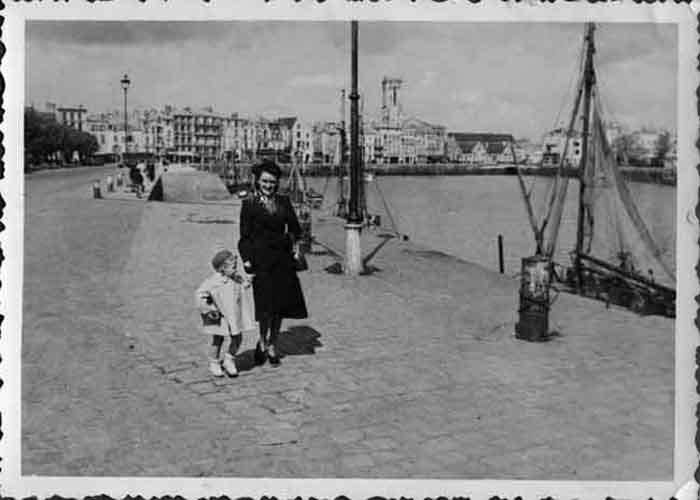 Un petit enfant et sa maman sur les pavés des quais de La Rochelle entre 1948 et 1951