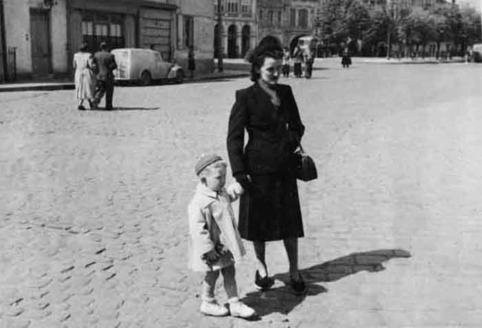 Un petit enfant et sa maman sur les pavés de La Rochelle entre 1948 et 1951