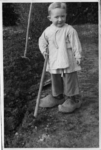 Un petit enfant dans des gros sabots de bois à Aytré entre 1948 et 1951