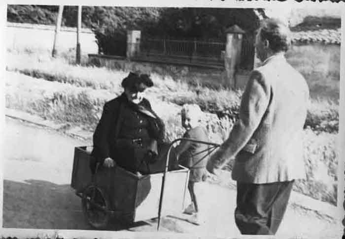 Une vieille dame poussée dans une brouette en bois entre 1948 et 1951 à Aytré