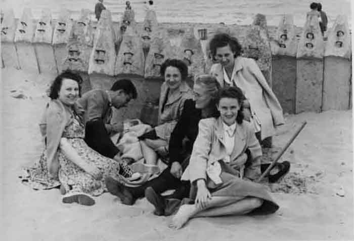 Famille assise sur la plage d'Aytré en 1950 adossée à des pieux en béton posés par les Allemands pendant la guerre pour empêcher un éventuel débarquement r