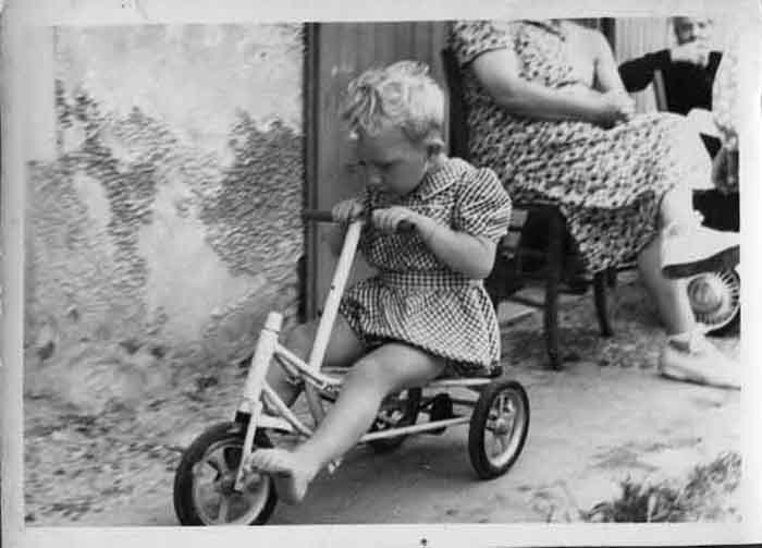 Petit enfant sur un tricycle dans un jardin à Aytré entre 1948 et 1951