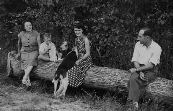Famille assise sur un tronc d'arbre en 1955 dans la forêt de Chizé