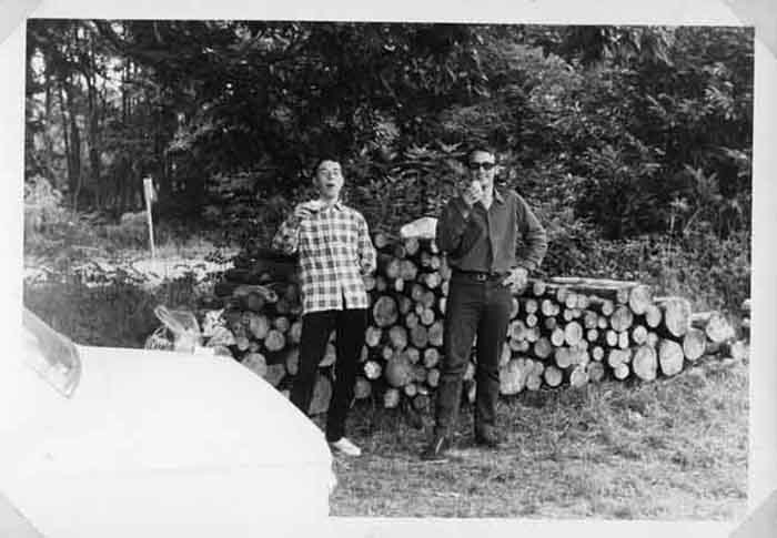 Pause pique-nique près d'un tas de rondins de bois entre 1966 et 1972 en Charente-Maritime