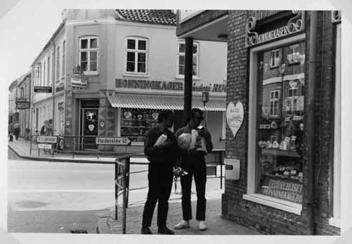 Deux jeunes touristes près d'un magasin de pain d'épices dans la ville de Christiansfeld au Danemark en août 1968