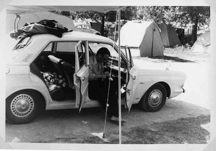 Un jeune homme dans sa voiture dans un camping en Suède en août 1968