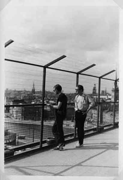 Deux jeunes touristes sur un pont grillagé à Stockholm en Suède en août 1968