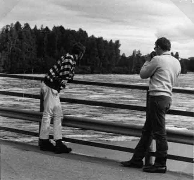 Deux jeunes touristes sur un pont à Borlange en Suède en août 1968