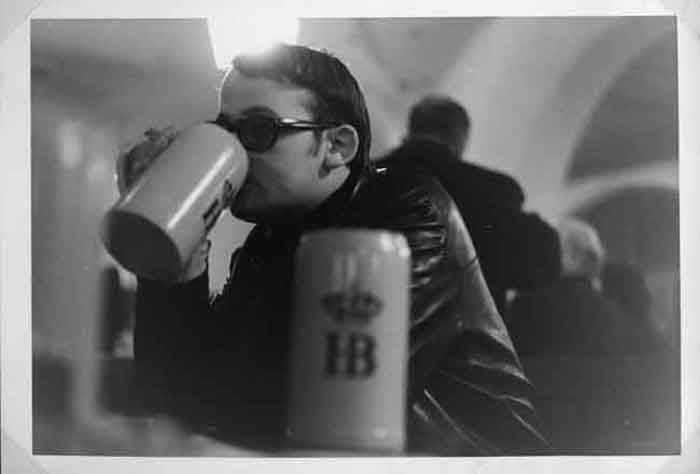 Jeune touriste la chope à la main dans une taverne en Allemagne en 1968