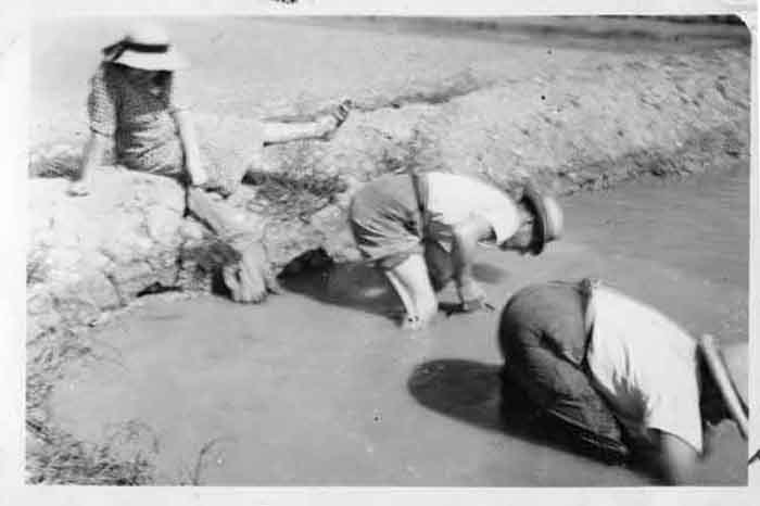 Deux hommes et une femme mettent des huîtres en claires dans un bassin à Aytré en 1936