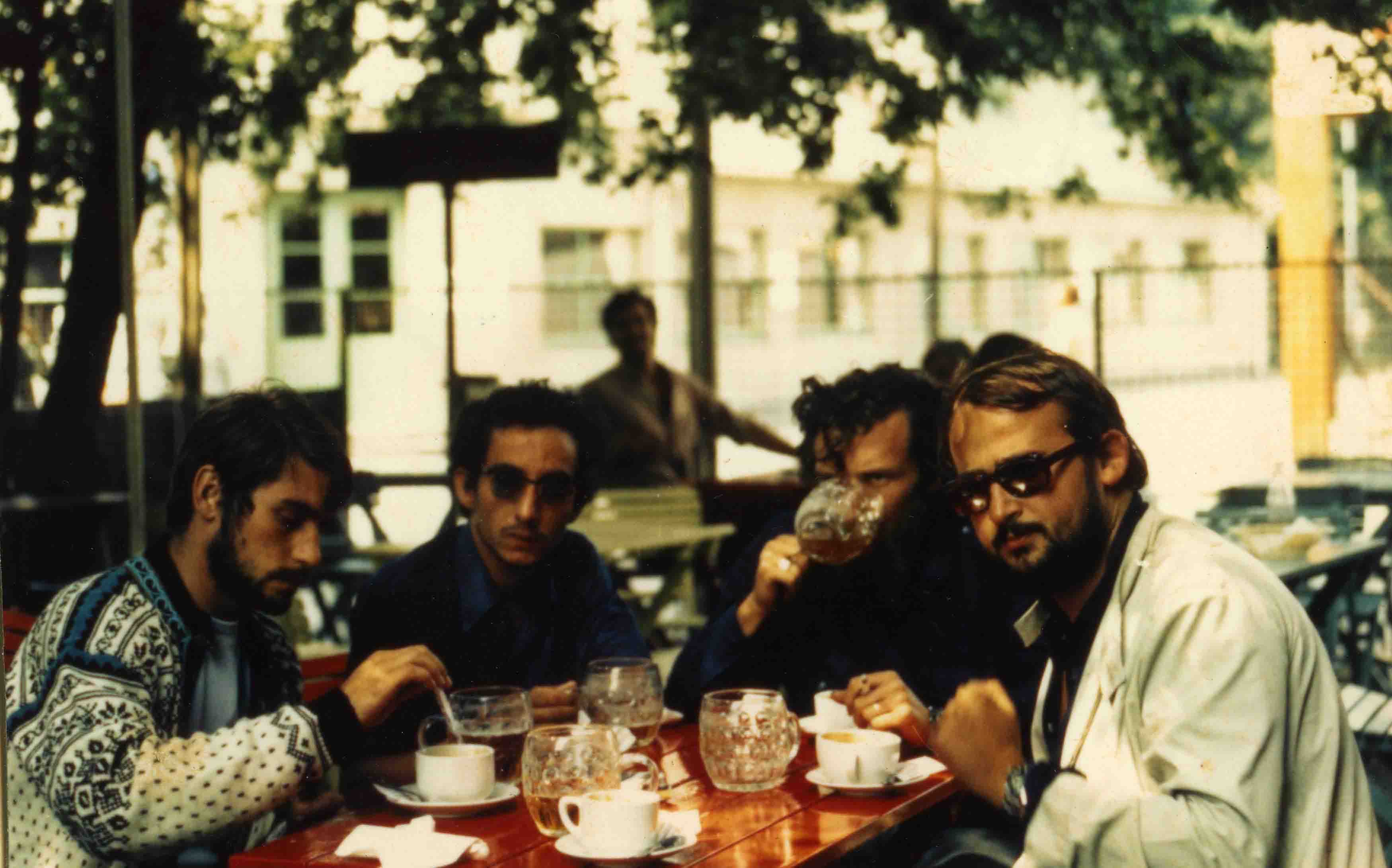 Quatre jeunes touristes à la terrasse d'un café dans la ville de Vienne en Autriche en 1970