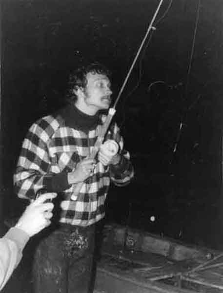 Jeune homme tenant une canne à pêche de nuit en mars 1971 sur l'île d'Elle