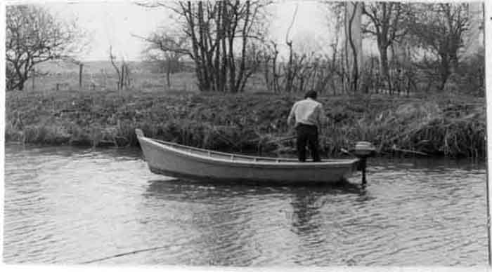 Jeune homme sur une barque à moteur sur l'île d'Elle dans le Marais poitevin en mars 1971