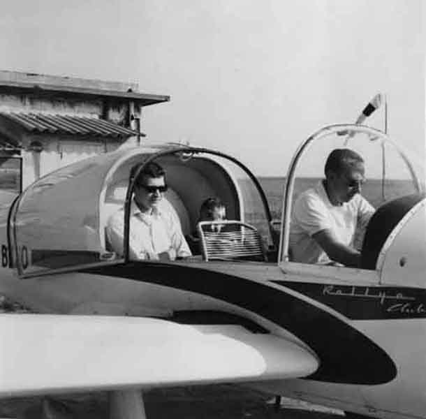 Un jeune homme et un petit garçon dans un petit avion Rallye en août 1965 à l'aérodrome de Laleu La Rochelle