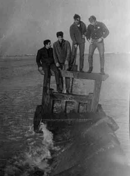 Jeunes hommes sur une digue sur la plage d'Aytré en février 1965