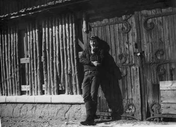 Jeune homme posant sur un cabane de rondins de bois en 1965 à Châtelaillon