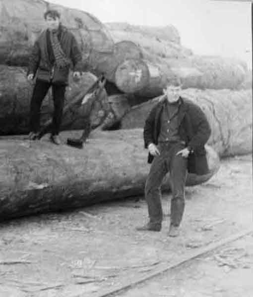 Deux jeunes hommes sur des billes de bois sur le port de La Pallice en novembre 1965.