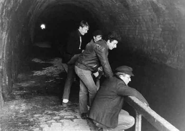 Quatre jeunes sous un tunnel dans le canal de Dompierre-sur-Mer en novembre 1965