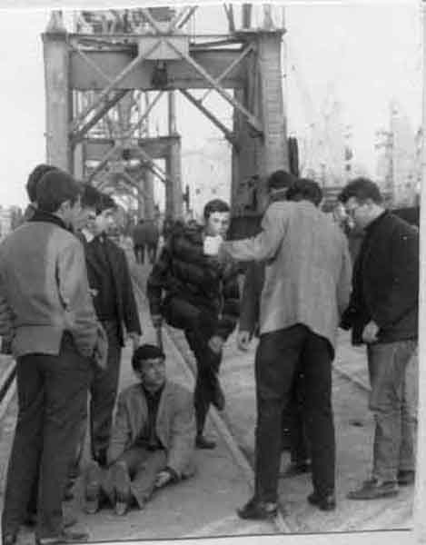 Scène pour les besoins du tournage du film amateur "À perdre haleine" au môle d'escale réalisé par Jacky Yonnet et sa bande d'amis à La Rochelle en novembre 1965