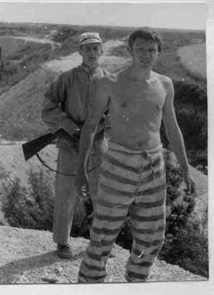 Jeunes hommes déguisés en bagnards pour les besoins du tournage du film amateur "Les six rebelles" réalisé par Jacky Yonnet et sa bande d'amis sur l'île de Ré en juillet 1966
