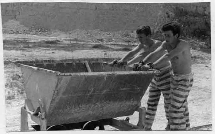 Jeunes hommes déguisés en bagnards pour les besoins du tournage du film amateur "Les six rebelles" réalisé par Jacky Yonnet et sa bande d'amis sur l'île de Ré en juillet 1966