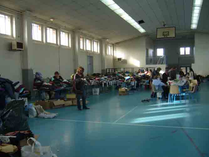 Gymnase d'Aytré où sont stockés couvertures et vêtements destinés aux sinistrés de la tempête Xynthia le 28 février 2010