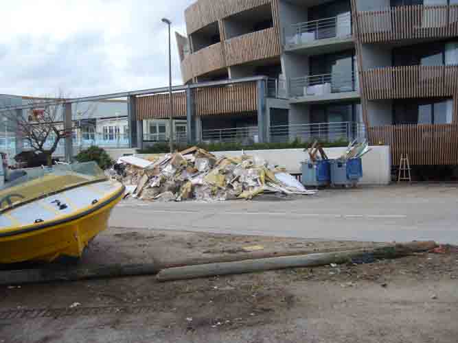 Déchets et débris causés par le passage de la tempête Xynthia le 28 février 2010 entassés près d'un immeuble à Aytré