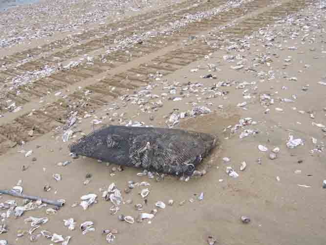 Pochons d'huîtres échoués sur la plage d'Aytré après le passage de la tempête Xynthia le 28 février 2010
