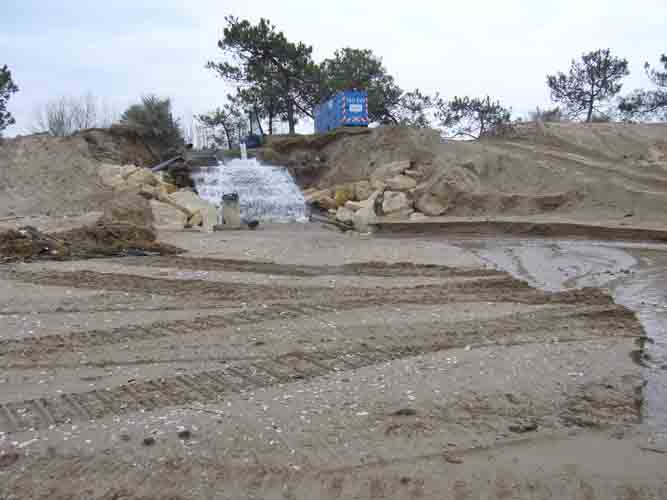 Quelques jours après le passage de la tempête Xynthia du 28 février 2010, l'eau derrière la plage est pompée et évacuée dans la mer à Aytré