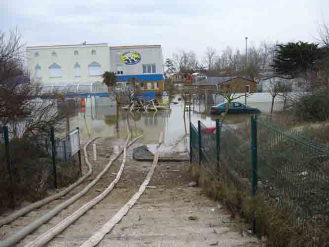 Le camping de la plage inondé et l'évacuation des eaux vers la plage à l'aide de tuyaux après le passage de la tempête Xynthia le 28 février 2010