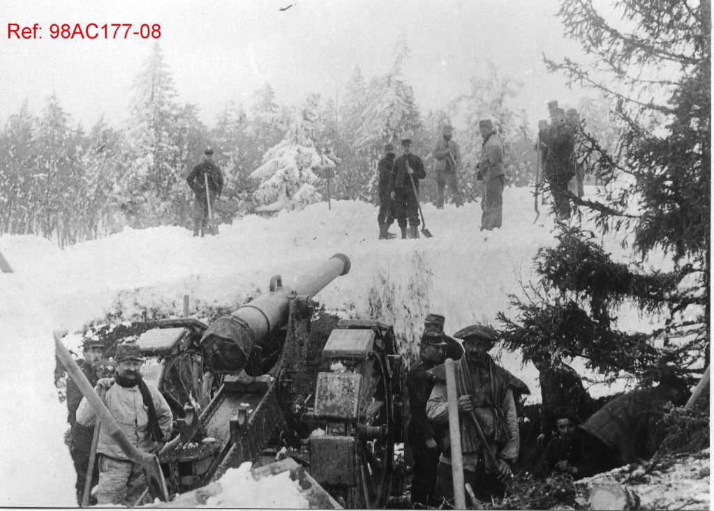 Canon d’artillerie positionné dans la neige pendant la Première Guerre mondiale