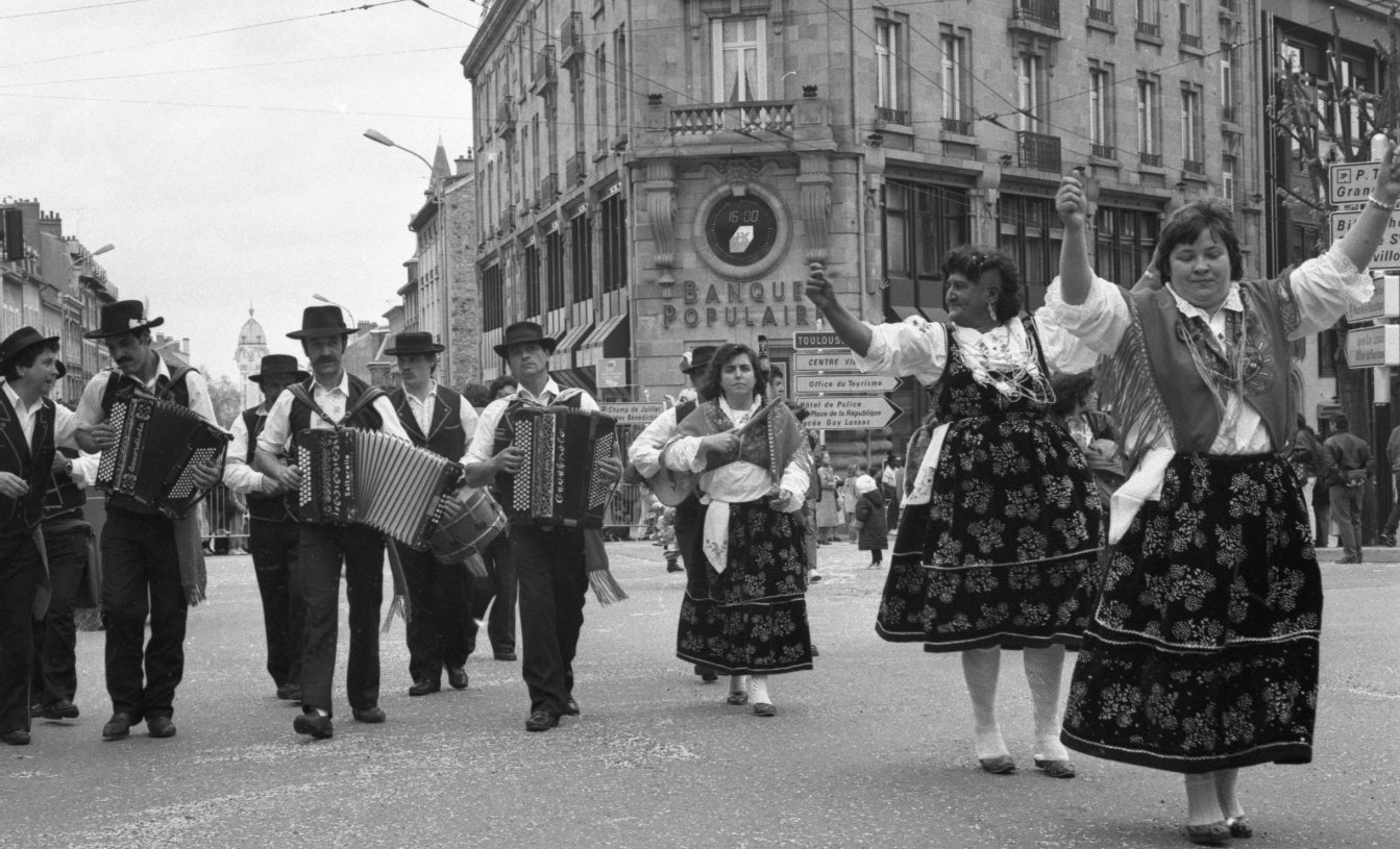 Le groupe folklorique franco-portugais "Os Amigos" défile, avenue de la Libération à Limoges, pendant le carnaval, en avril 1991.