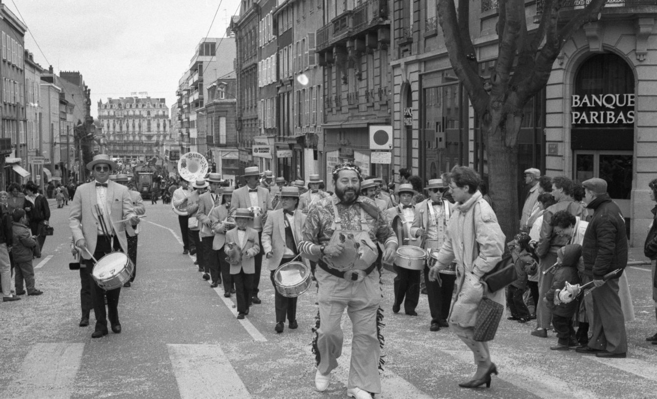 La fanfare "Banda" défile boulevard Carnot à Limoges, pendant le carnaval, en avril 1991.