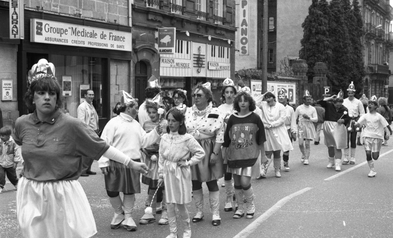 Un groupe déguisé défile boulevard Carnot à Limoges, pendant le carnaval, en avril 1991.