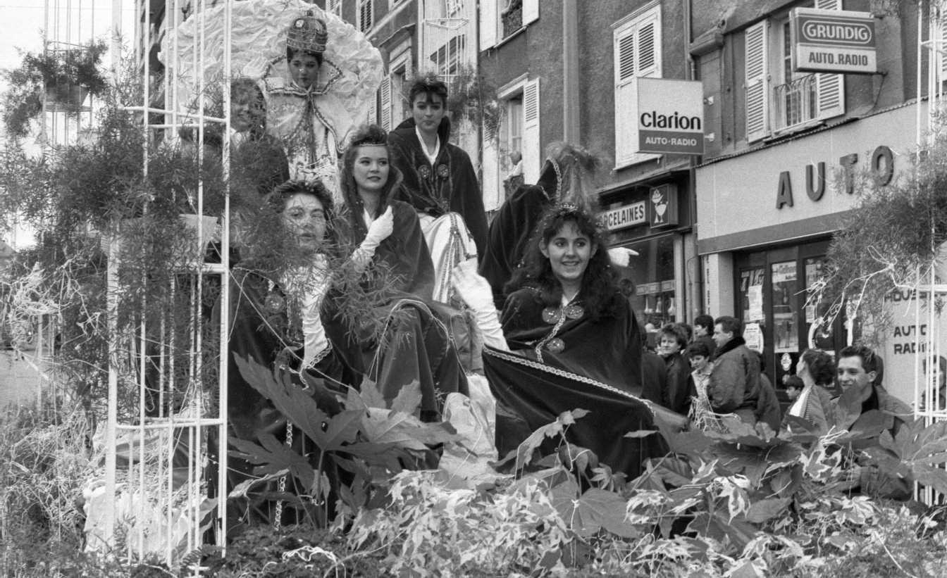 Le char des Miss défile dans une rue de Limoges, pendant le carnaval, en avril 1991.