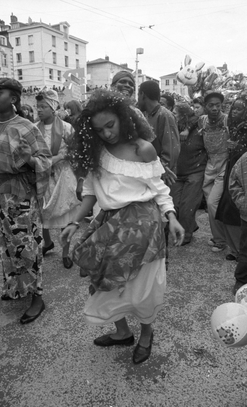 Une danseuse autour d'autres membres d'une troupe de danse, lors du défilé du carnaval, avenue Baudin à Limoges, en avril 1991.