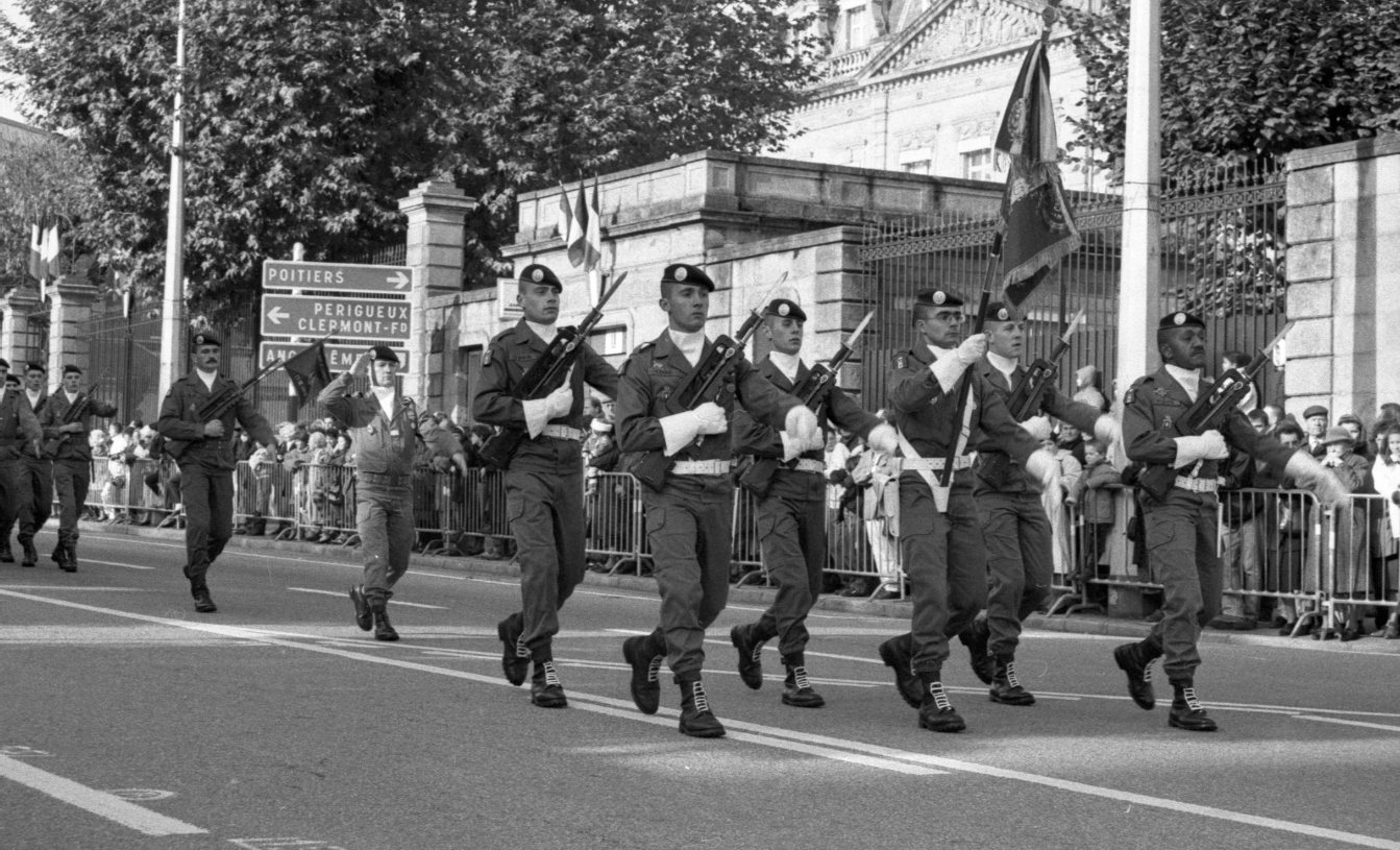 Des militaires défilent place Jourdan à Limoges lors de la cérémonie d'hommage célébrant l'armistice de la Première Guerre Mondiale, en novembre 1991.