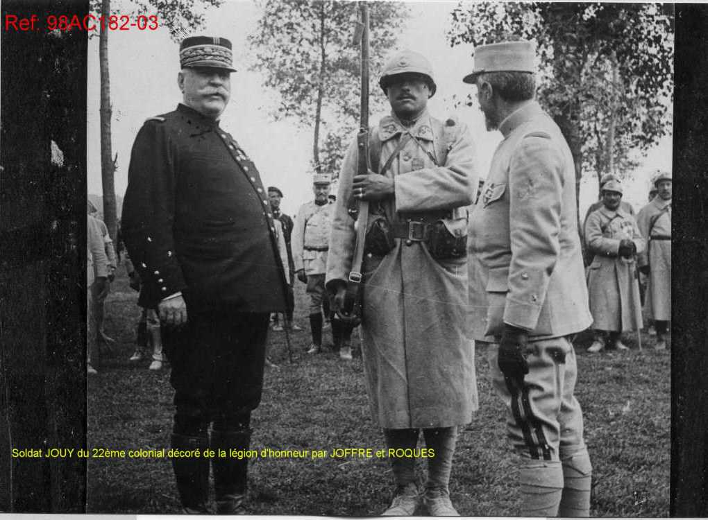 Le soldat Jouy reçoit la Légion d'Honneur pour bravoure des mains des généraux Joffre et Roques. Il se tient au garde à vous.