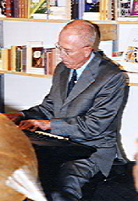 Jean-Georges Bulcourt joue du piano sur le stand de la librairie Mollat lors du cocktail du Salon du Livre, le 13 octobre 2000 au Hangar 14.