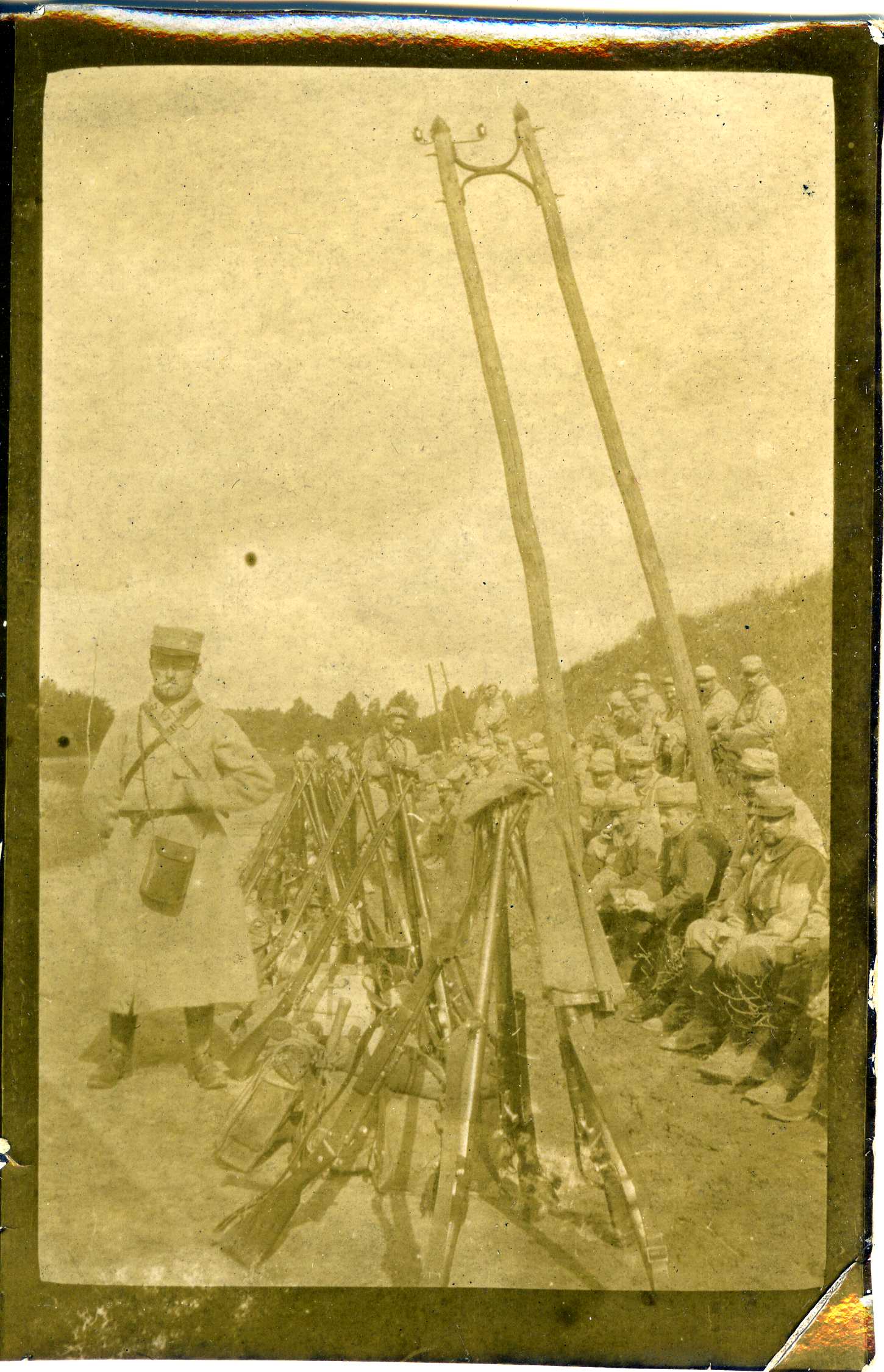 Compagnie de soldats au repos au bord d'une route. Les fusils sont rangés. Au premier plan à gauche se trouve certainement le chef de la compagnie.