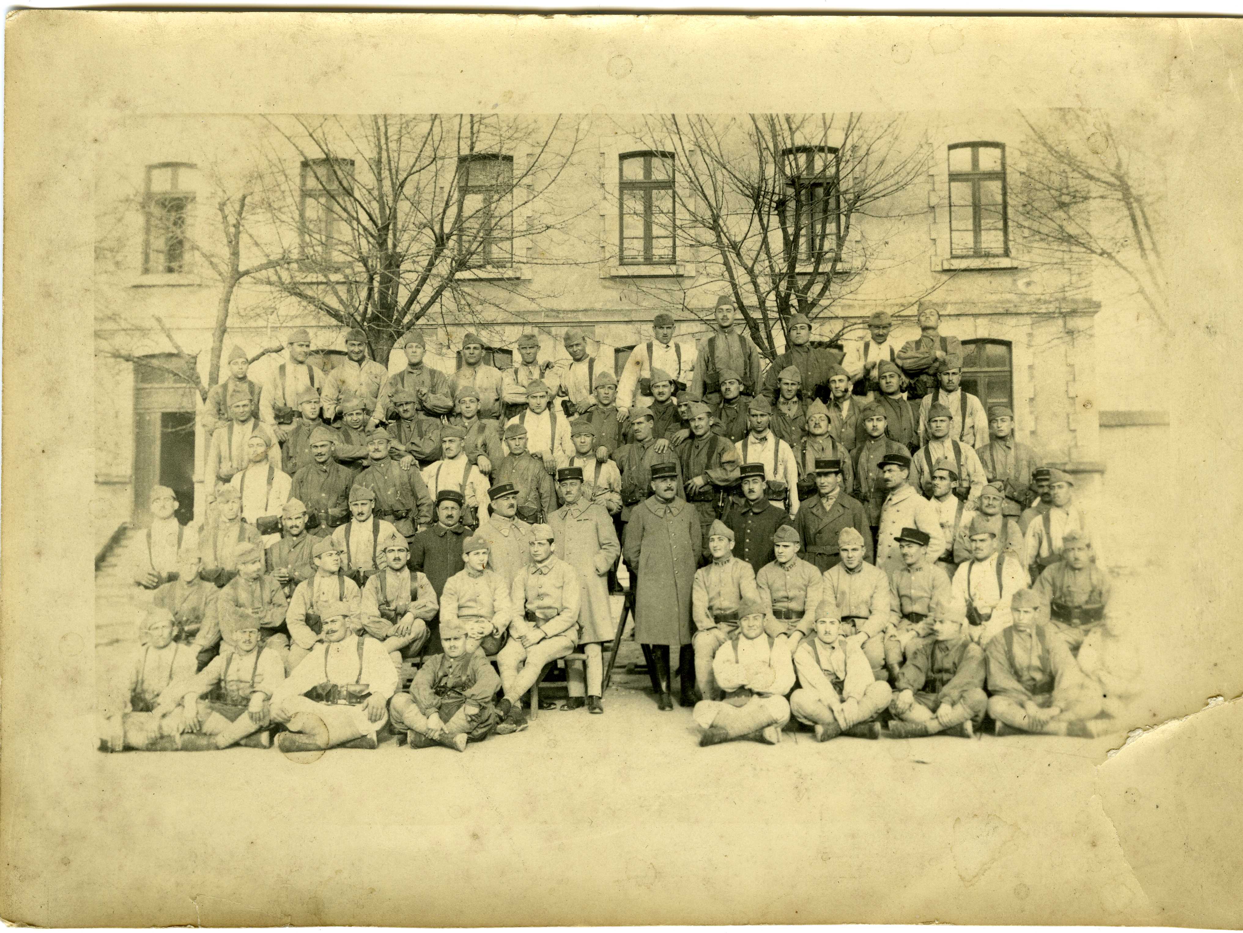 Compagnie en cantonnement, posant pour une photo souvenir. Le mélange de tenues (certains en uniforme complet, d’autres en chemise) laisse penser à un moment de repos ou de vie quotidienne, pas un rassemblement officiel.