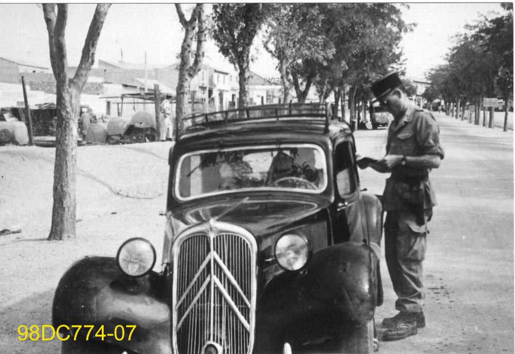 Contrôle d'identité effectué par un gendarme dans une rue en Algérie dans un contexte de guerre.