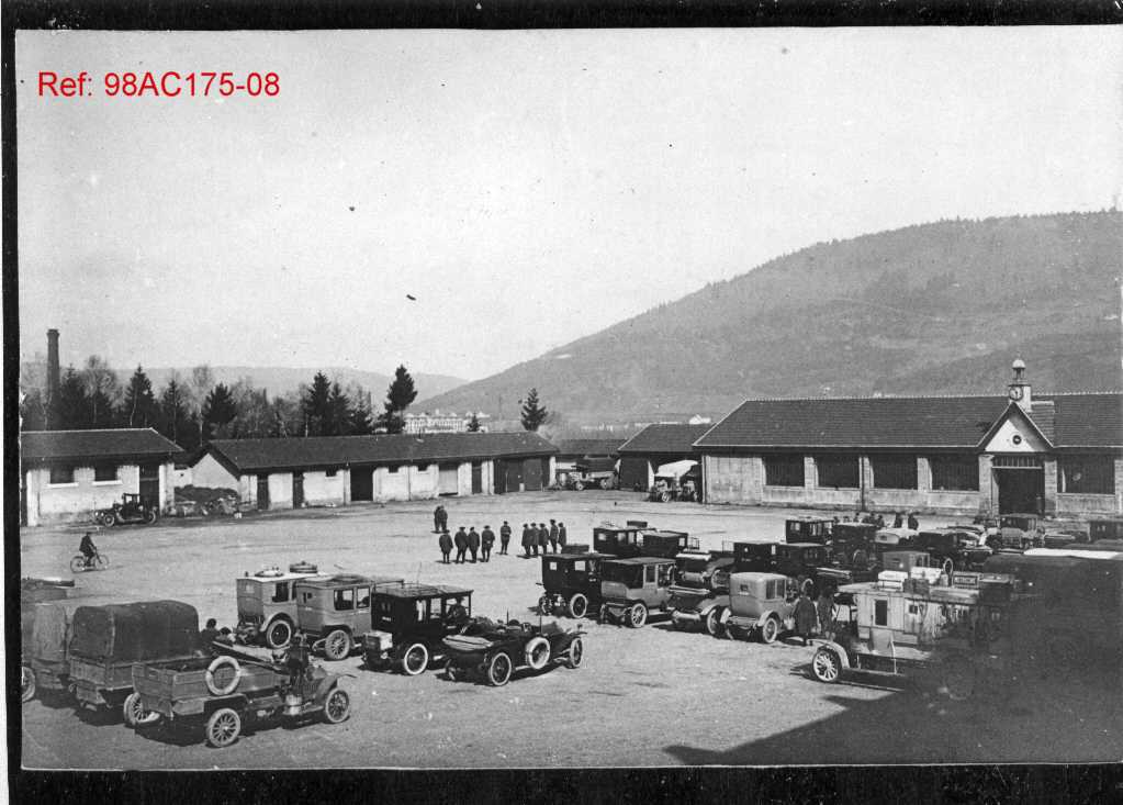 On y voit de nombreux camions et véhicules utilitaires anciens, typique de la Première Guerre mondiale ou de l’entre-deux-guerres. On y voit aussi des bâtiments longs et bas ressemblant à des hangars, écuries ou ateliers militaires. Un groupe de soldats ou de personnels en uniforme est rassemblé au centre de la cour.