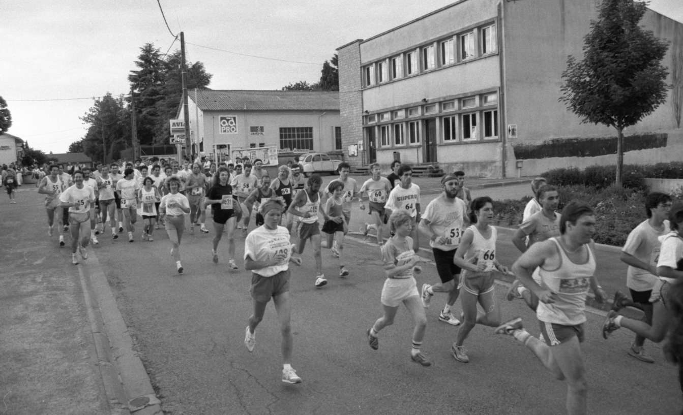Sur la ligne de départ, les coureurs s'élancent lors du cross de Verneuil, dans le département haut-viennois, en juin 1991.