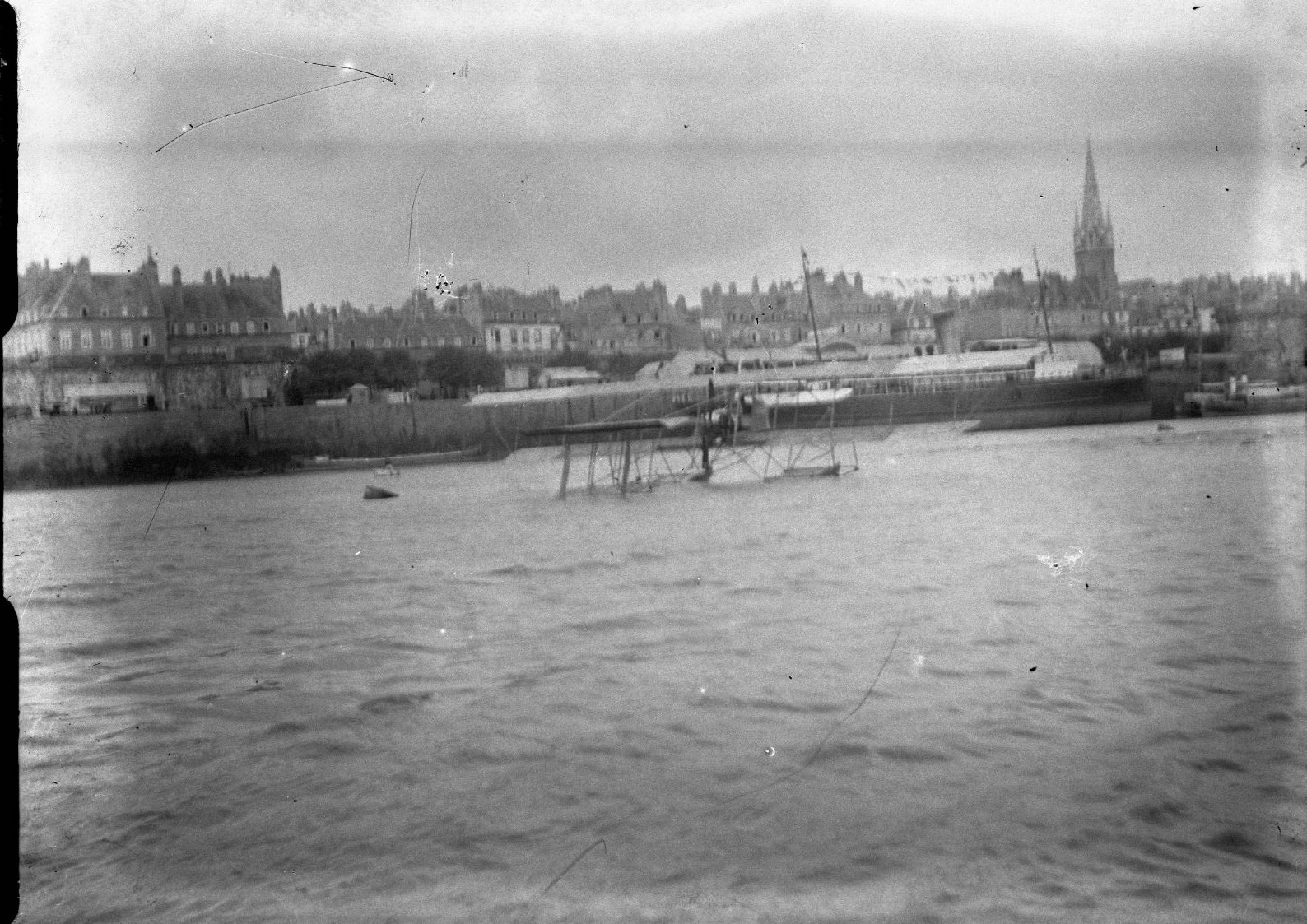 Un biplan hydravion dans le port de Saint-Malo, dans les années 1910.