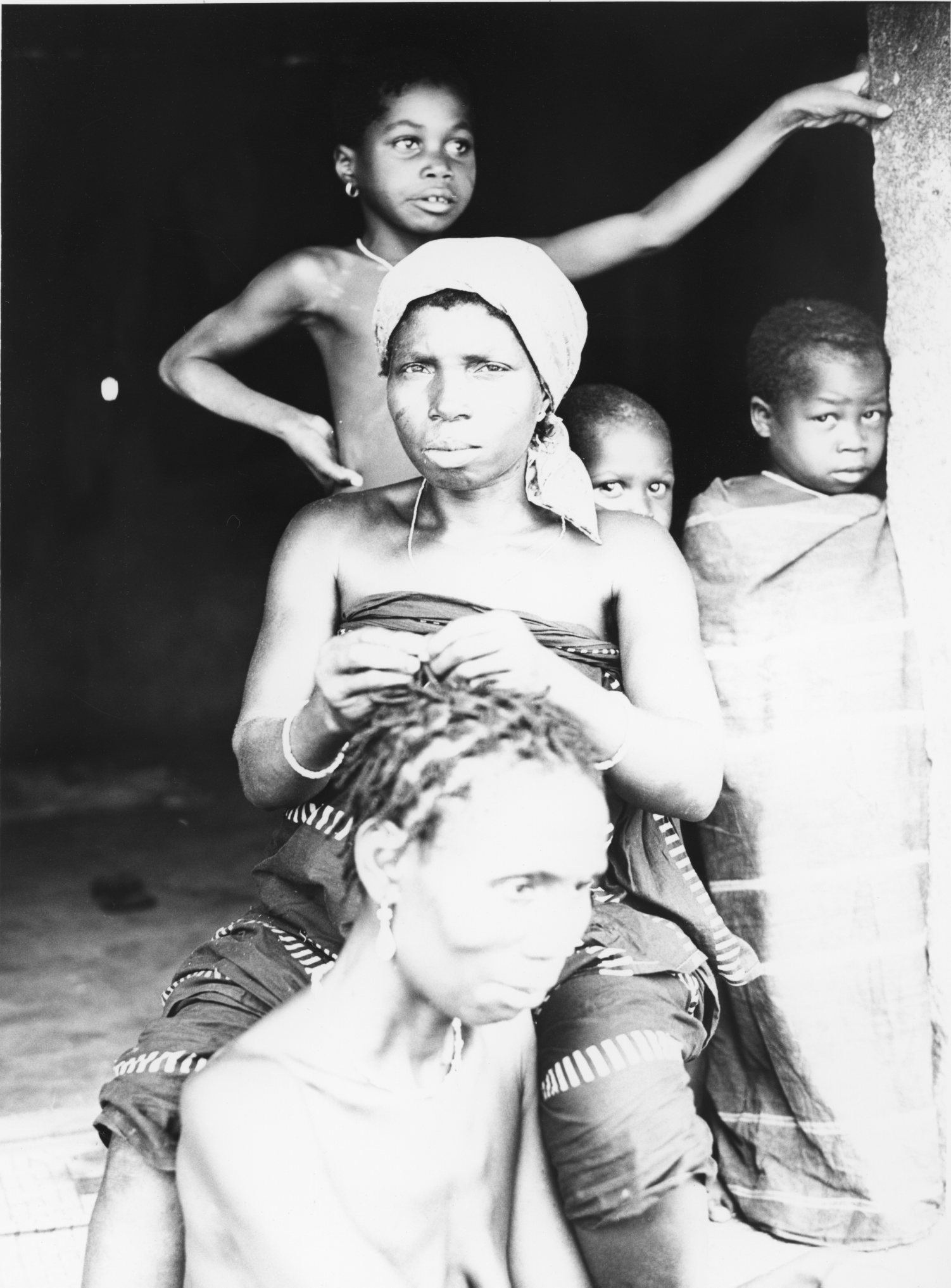 Dans un village baoulé en Côte d'Ivoire, une femme en coiffe une autre, dans la seconde moitié du XXème siècle.