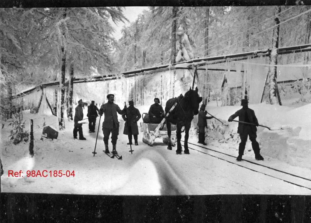 Déblayage de la neige sur la route de Honeck. On y voit des hommes en tenue sombre uniforme, en skis ou raquettes, utilisés par les troupes alpines ou unités de montagne, un cheval attelé à un traîneau : moyen courant de transport militaire en terrain enneigé, une ligne ou structure au-dessus du chemin : cela peut être une installation logistique (téléphérique, conduite, ravitaillement).