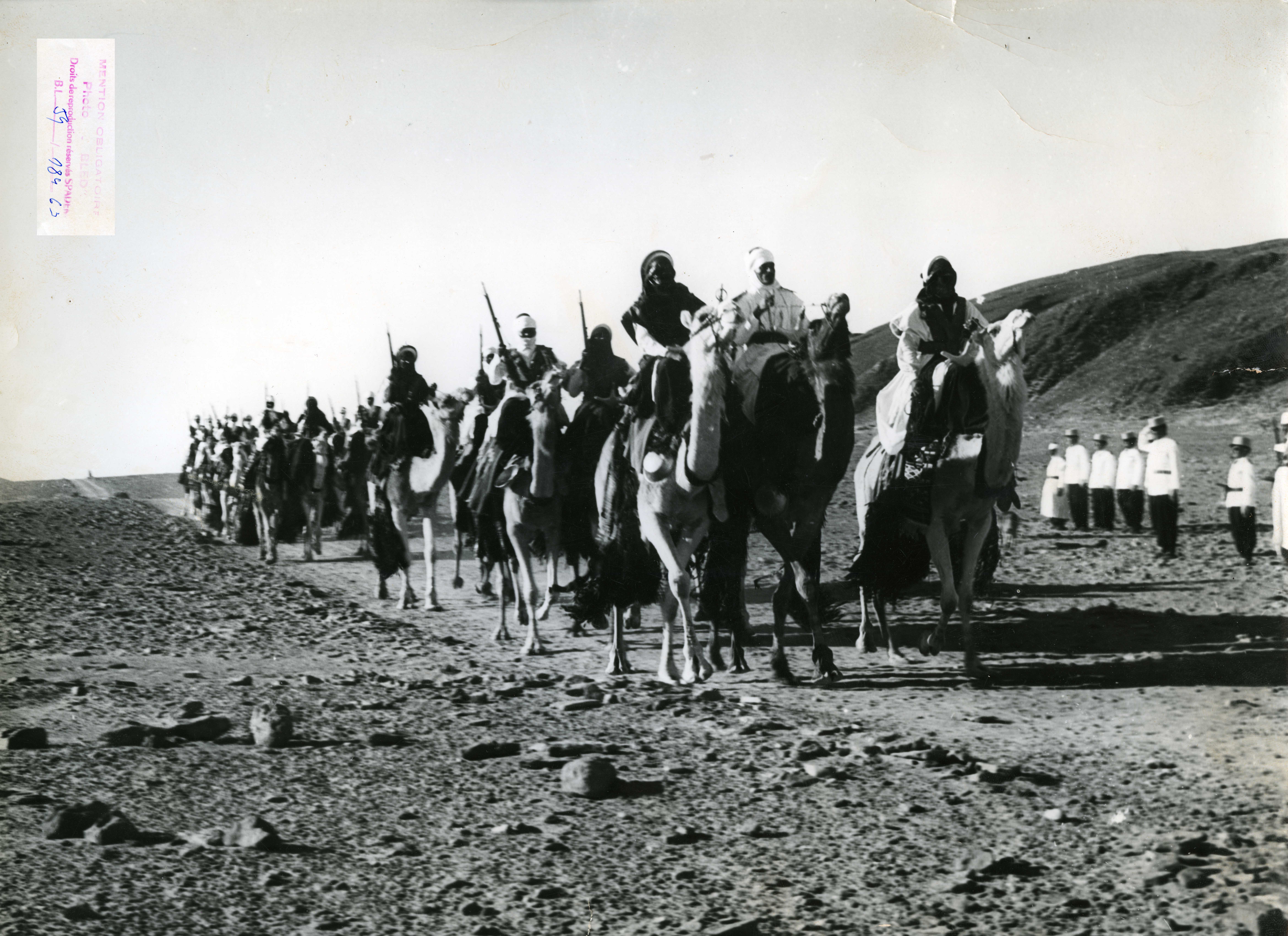 Défilé d'une compagnie de militaires sur des dromadaires dans le désert dans les années 1950